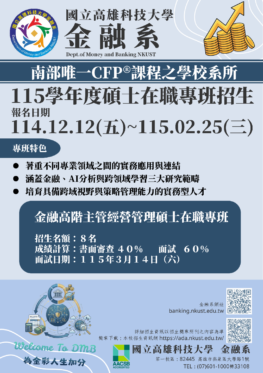 國立高雄科技大學管理學院金融高階主管經營管理碩士在職專班 (金融EMBA)招生